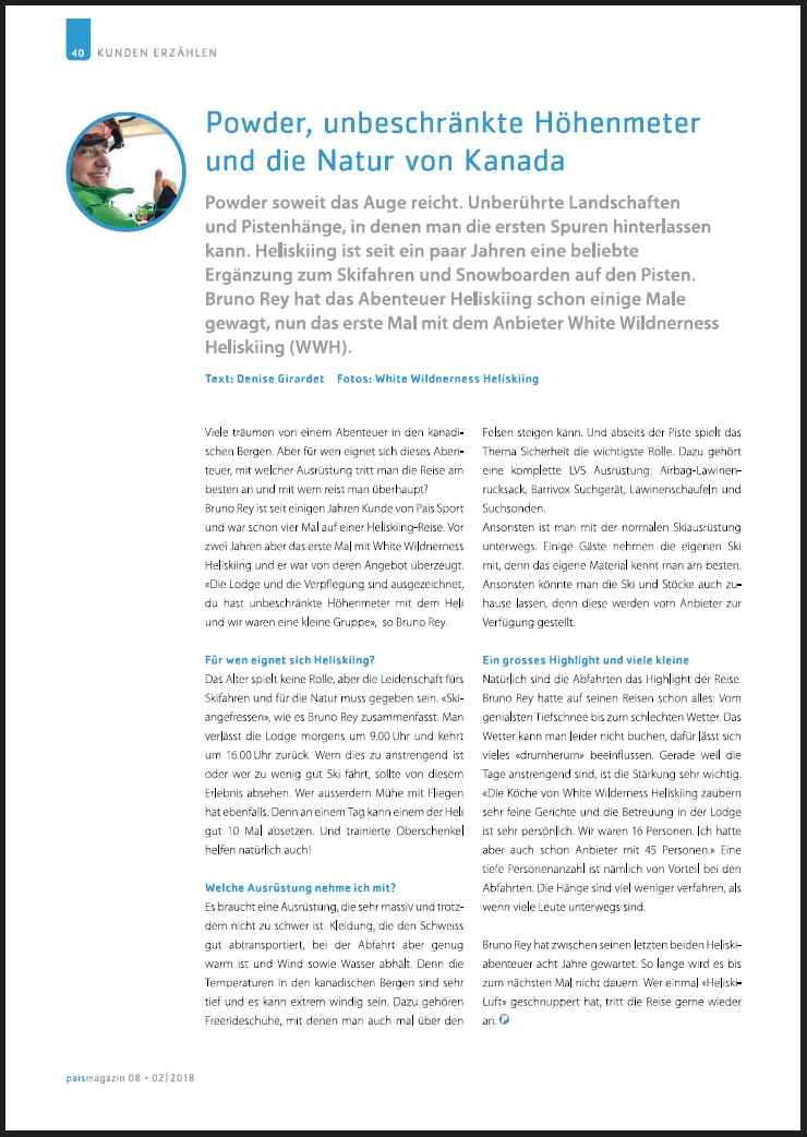 Powder soweit das Auge reicht. Unberührte Landschaften und Pistenhäge, in denen man die ersten Spuren hinterlassen kann. Heliskiing ist seit ein paar Jahren eine beliebte Ergänzung zum Skifahren und Snowboarden auf den Pisten. Bruno Rey hat das Abenteuer Heliskiing schon einige Male gewagt, nun das erste Mal mit dem Anbieter White Wildnerness Heliskiing (WWH).